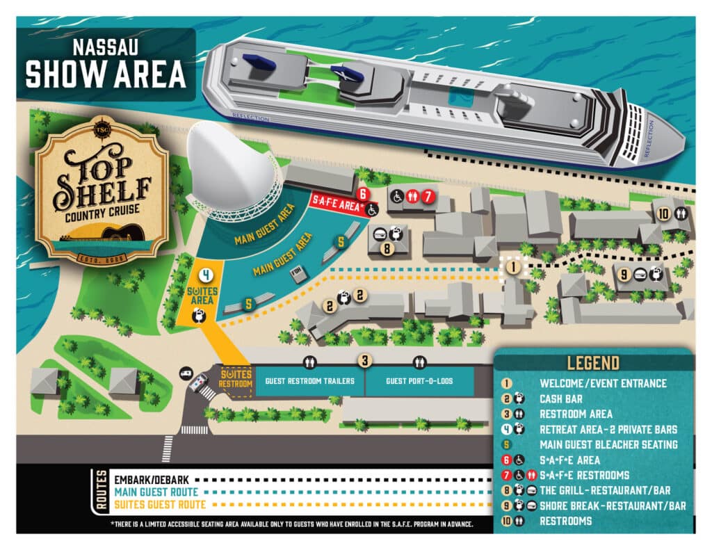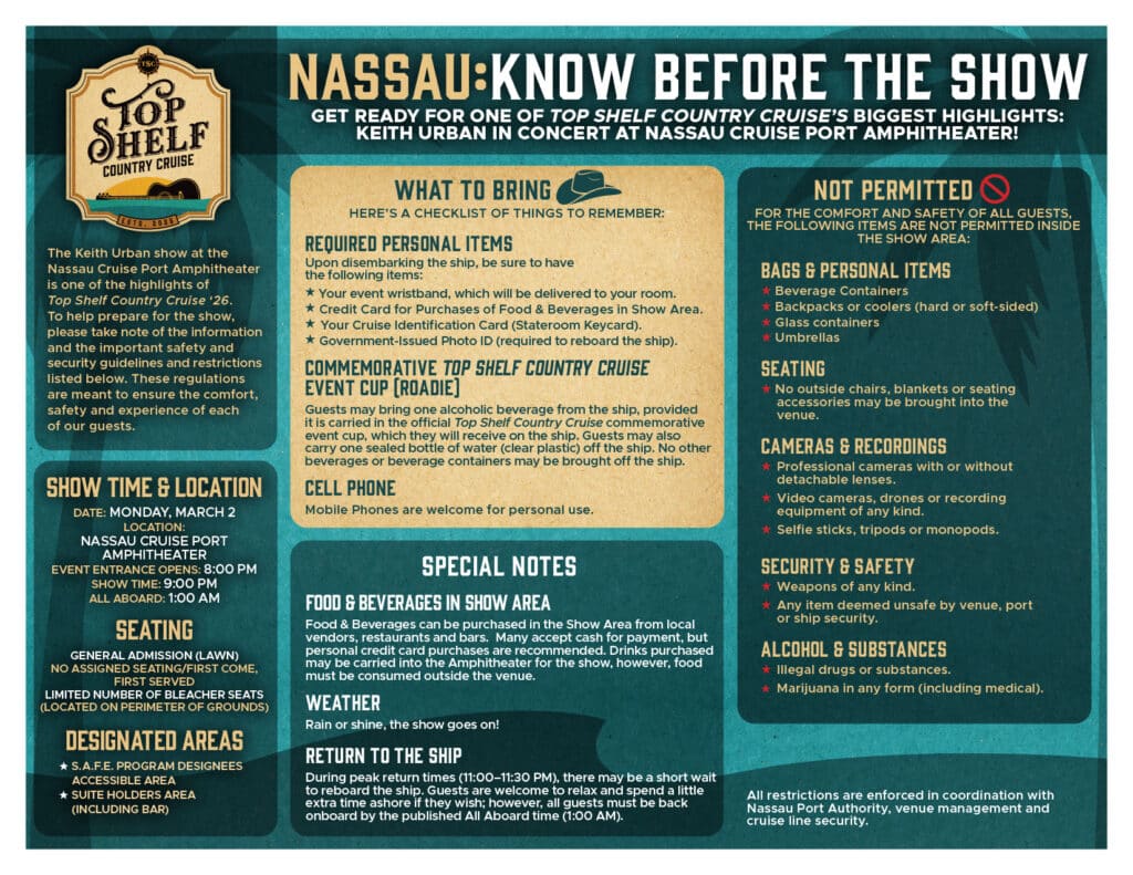 As the tailgate winds down, it’s time to head out! Feel free to fill your Top Shelf Country Cruise-branded reusable Roadie Cup that you will receive at the Pre-Concert Tailgate Party with a walk-me-down drink from one of the bars at the Pre-Concert Tailgate Party or from the Passport Bar located on Deck 3, the last bar you will pass prior to exiting the ship on your way to the concert. Guests will have a quick 7-10 minute walk directly to the Nassau Cruise Port amphitheater. The gates open at 8:00 PM. Before leaving the ship, remember to put on the entry bracelet that was delivered to your stateroom the night before. At 9:00 PM, Keith Urban takes command of the night, turning Nassau into the most iconic open air venue imaginable. Expect a high octane mix of hits, guitar shredding magic and that signature Keith Urban charisma that lights up the entire shoreline. It’s Keith under the stars and you’re close enough to feel every note. To keep the energy going, the amphitheater offers everything you need: drinks and snacks for purchase, plenty of restrooms and a small bleacher section for guests who want to catch their breath before jumping back into the action. |