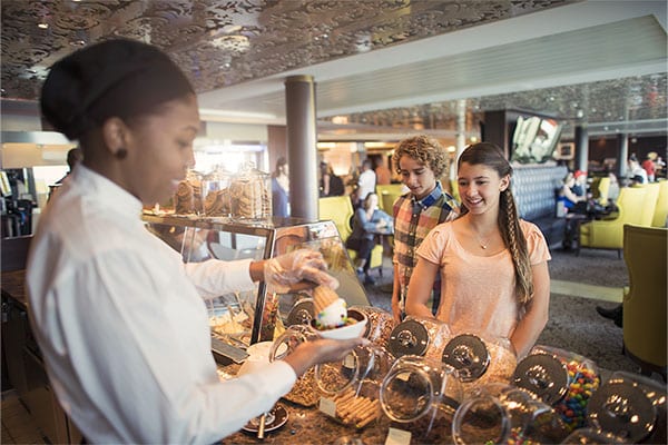 This casual dining spot offers an international marketplace feel with food choices from around the globe, including sushi, pizza and pasta, a carving station, plus a great salad bar and a grilling station. Daily dining themes accent the worldly nature of this dining venue. It’s open for breakfast, lunch, dinner, and late-night snacks for the after-party munchies!